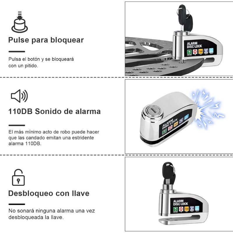 • Esta cerradura de disco es una solución práctica para proteger tu moto o bicicleta mientras esta estacionada fuera o en casa.