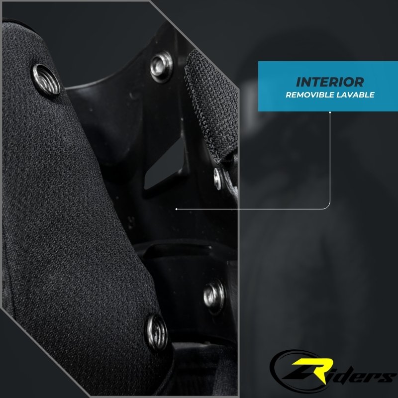 • Protección Lateral Extendida: Las «alas» laterales son más anchas de lo habitual para proteger la cara interna y externa de la pantorrilla contra el roce con el chasis de la motocicleta.